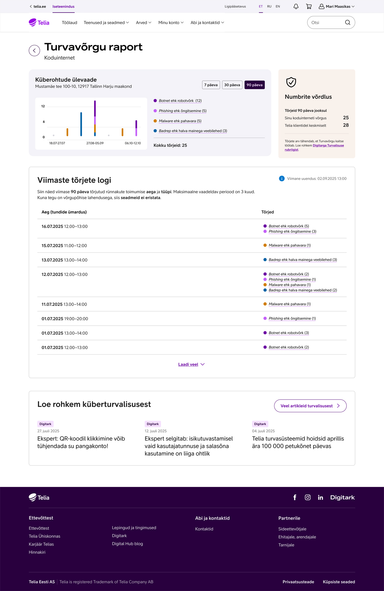 Turvavõrgu lahendusega käib kaasas ka reaalajas Telia iseteeninduses nähtav turvaraport, mis annab ülevaate tuvastatud ja blokeeritud küberohtude kohta konkreetsel koduinterneti aadressil. Nii on kasutajale alati näha, millist tüüpi ohte on Turvavõrk tema koduinterneti ühenduse osas tõkestanud.