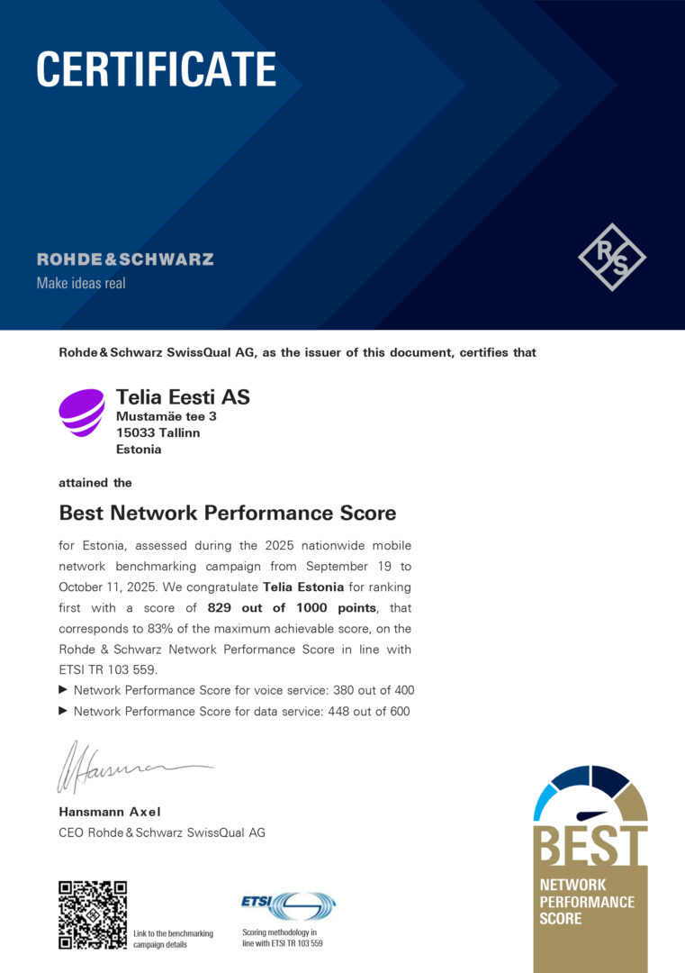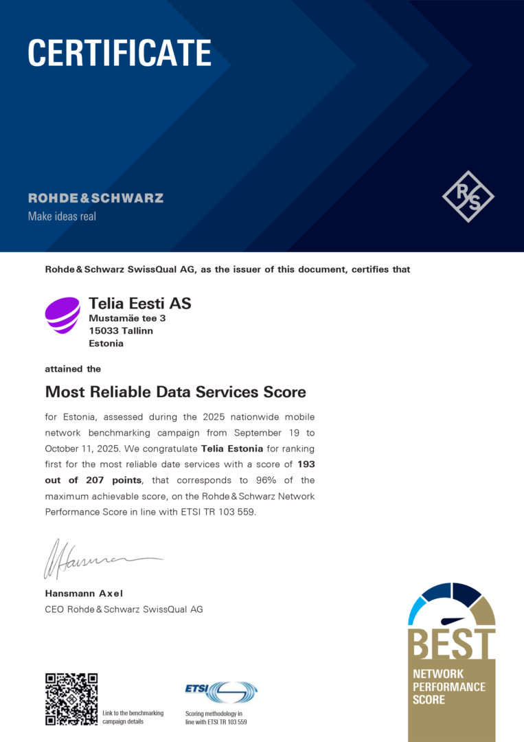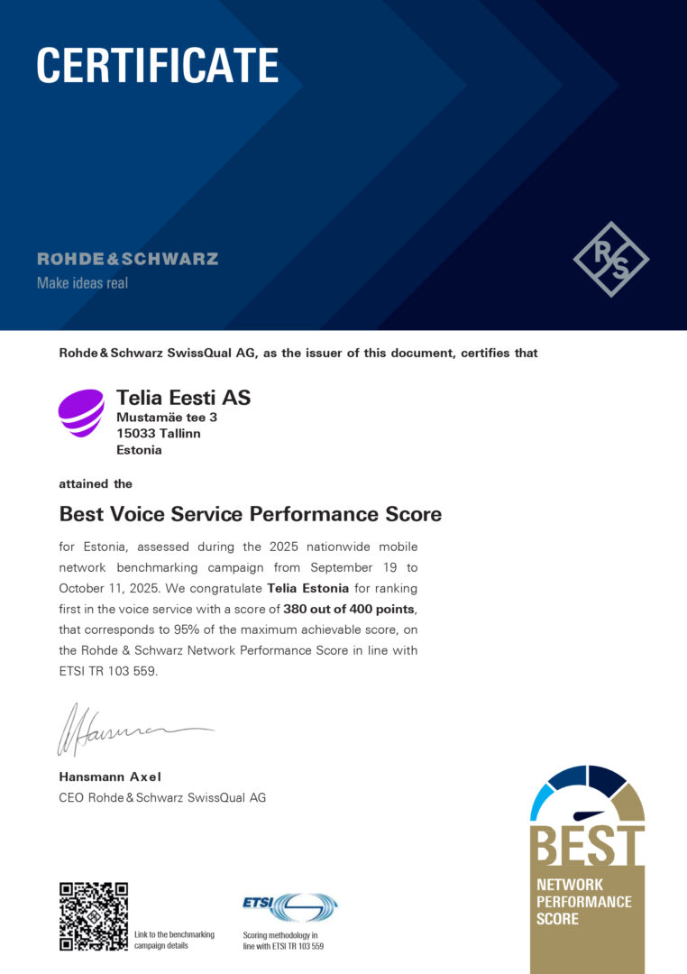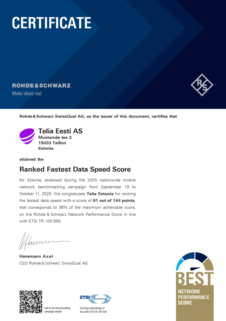 “Meil on hea meel Teliaga selle olulise projekti raames koostööd teha,” ütles Axel Hansmann, Rohde & Schwarz Swissqual AG tegevjuht. “Meie koostöö ei paku Teliale üksnes hindamatuid teadmisi nende võrgu toimivuse kohta, vaid aitab kaasa ka mobiilsidevõrkude kvaliteedi üldisele paranemisele Eestis. Mobiilse interneti kiiruste märkimisväärne kasv ja Telia kõrgeim tulemus meie võrdluskampaanias näitavad meie partnerluse tõhusust ning Telia võrgu kvaliteeti. Aitasime klienti ka varasemas teenuskampaanias, kus andsime kohandatud parendussoovitusi, kasutades mõõtmisteks Rohde & Schwarzi tipptasemel seadmeid. See võimaldas Telial oma tulemusi märkimisväärselt parandada.”