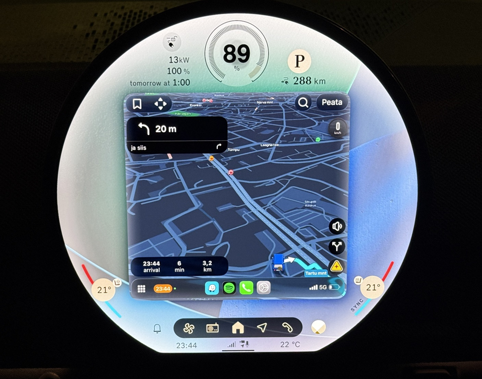 Ümmargune on küll minilik, kuid CarPlay ei oska end ümarat ekraani täiesti enda kasuks ära kasutada. Samas on kõik oluline Mini enda infost ekraanil olemas, seega sobivad koos töötama nii ümmargune ekraan kui kandiline äpp.
