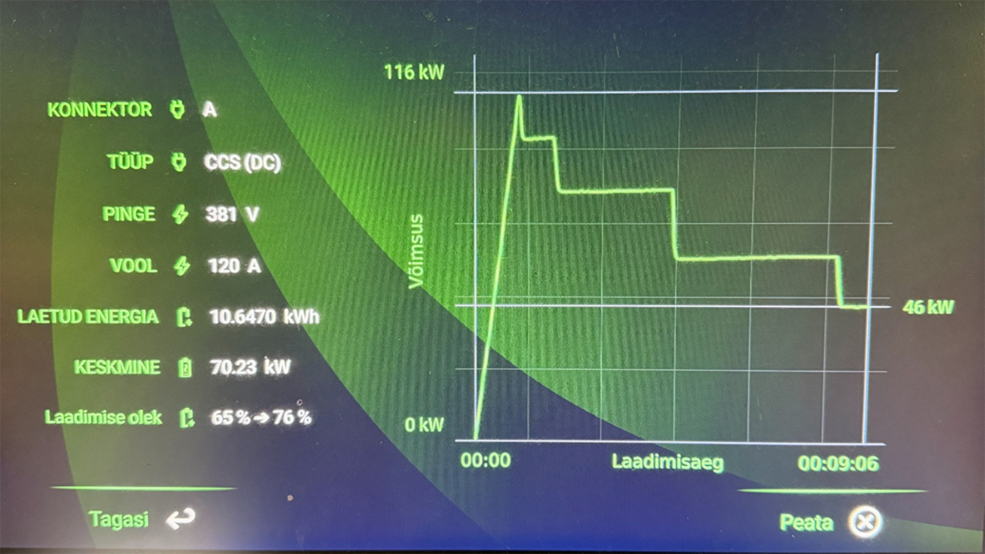 Päris 150 kW laadimiskiirust ei õnnestunud saavutada, kuigi kasutasin laadimisjaama sõitmiseks EV4 enda kaardirakendust, mis automaatselt aktiveerib akupanga optimeerimise kiireks laadimiseks. Suurim number, mis laadimisel ette sain, oli 116 kWh. Eks oma süü ole ka mul endal, sest testlaadmiseks oleks võinud olla aku tunduvalt tühjem. Uus tulija meie elektrilaadijate turul on Leedu riigiettevõtte kohalik tütarfirma Ignitis Eesti OÜ. Koostöös Grossi Toidukaupadega ning ka Maxima ketiga lisandub nende poodide parklatesse juurde uusi laadimisjaamasid. Ja kiidan just nende graafilist vaadet, mis annab ülihea ülevaate, millise võimsusega laadimine toimub ajas.