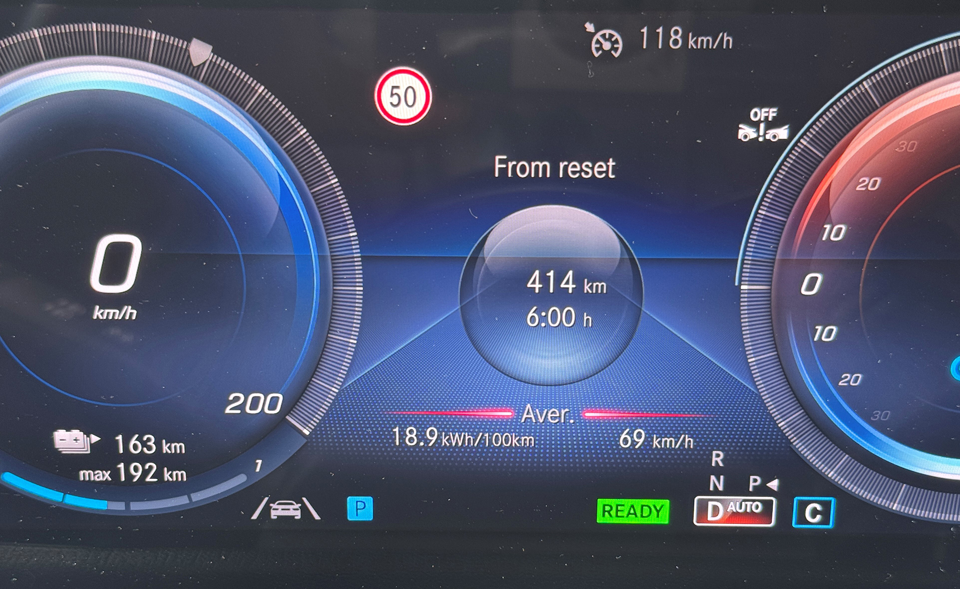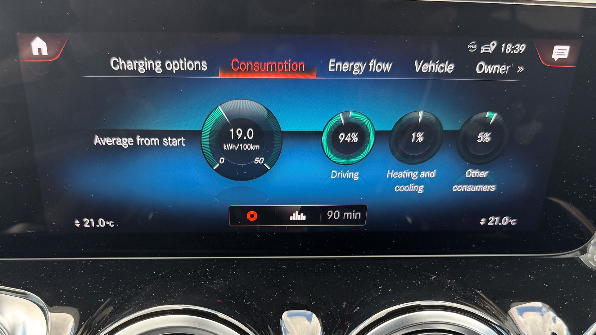 Keskmine energiakulu üle neljasaja kilomeetrisel testsõidul, mis sisaldas nii maanteed, vallasiseseid teid kui ka linnasõidu, tuli 18.9 kWh/100 km kohta. Ja see on päris tubli tulemus ehk täpselt see, mis tootja poolt lubatu.