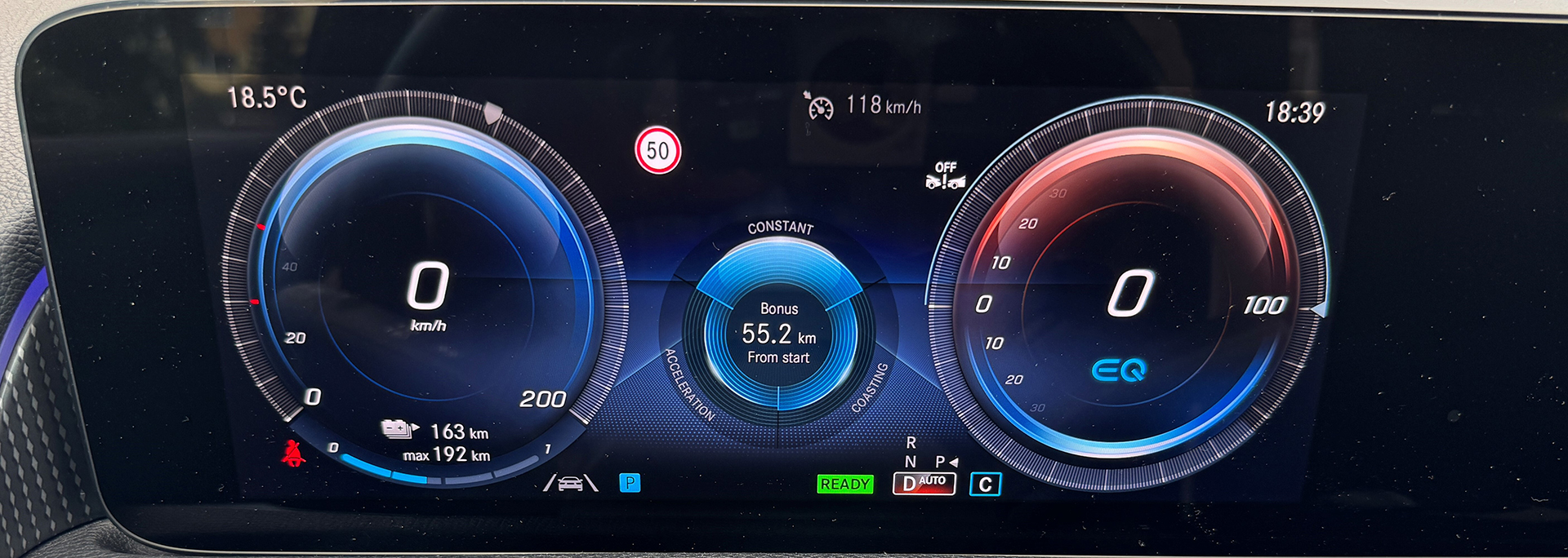 Väga hästi suudab Mercedes kuvada oma energiakulu, edestades selles oma graafilise lahendusega isegi Hyundai-Kona elektriautosid.