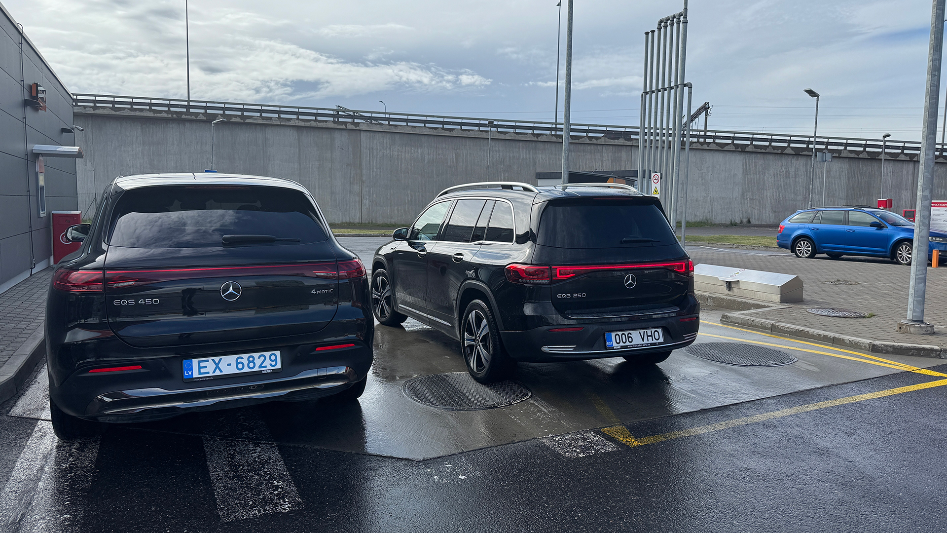 Tagant vaadates on väiksem linnamaastur EQB (paremal) ja tema suurem vend EQS (vasakul) tulede disainilt äratuntavalt samast perekonnast. Pildil juhuslik kohtumine Circe K jaamas.