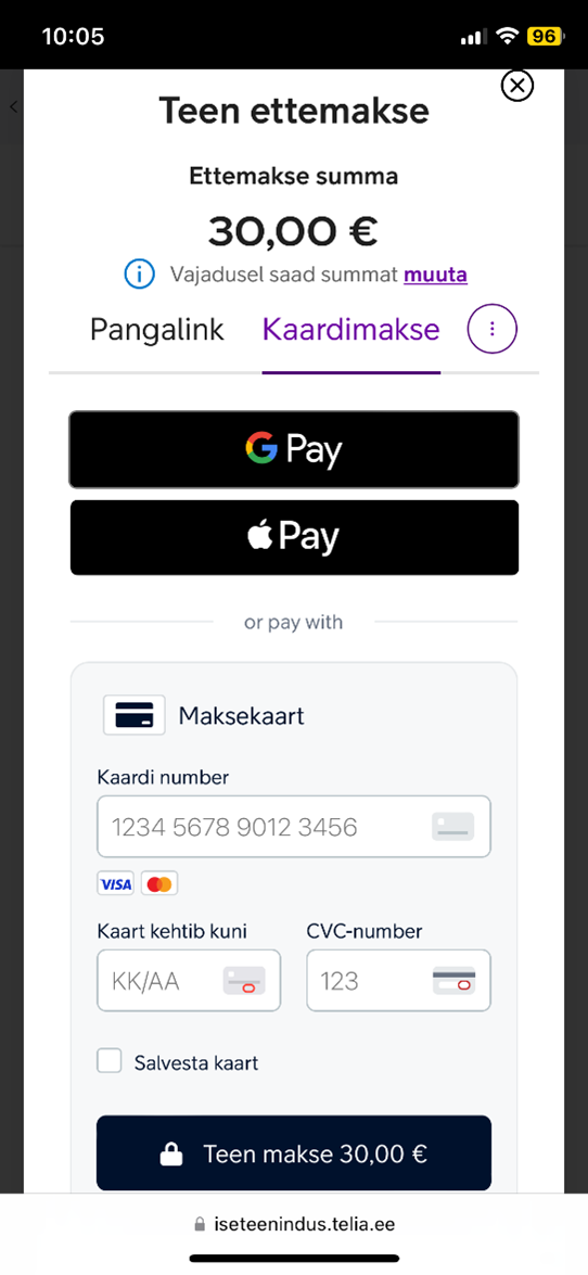 Apple Pay maksemeetodi kuva iseteeninduses – valige maksmisel Kaardimakse vaheleht, et leida ApplePay logoga nupp (nähtav iOS seadmes):