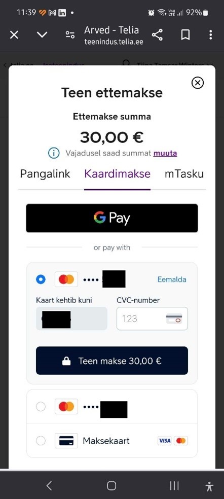 Google Pay maksemeetodi kuva iseteeninduses (Android/Windows seadmes) – valige maksmisel Kaardimakse vaheleht, et leida GPay logoga nupp: