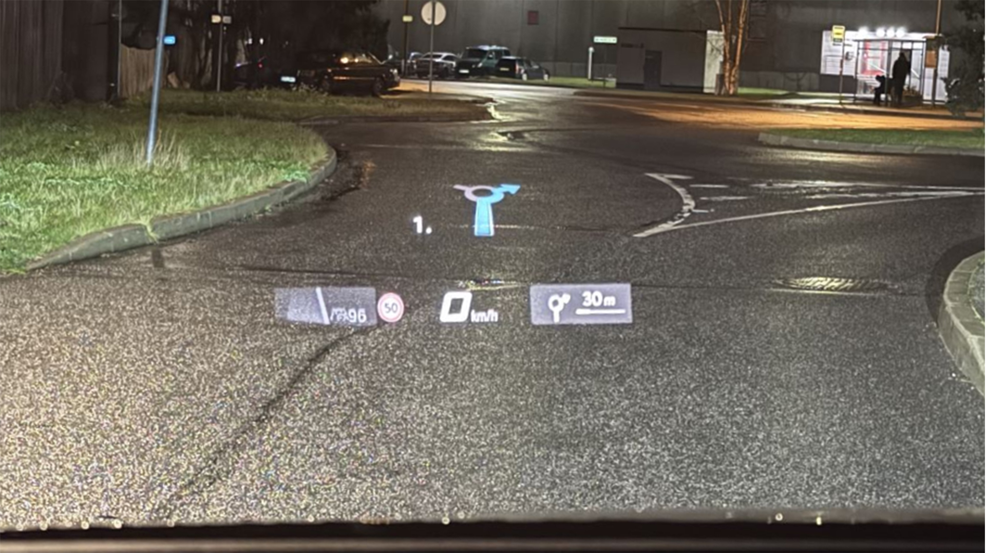 Huvitav lahendus on liitreaalsuse kasutamine, kus lisaks infokastikestele kuvatakse juhile kõik pöörded ning ohtlikud kurvid. Ja et küll küllale liiga ei tee, siis auto enda navi kasutamisel antakse juhile teada ees olevatest pööretest ning ohtudest tuuleklaasi alla servas olevate värviliste joontulukestega. Pööre paremale ning ekraani servas jookseb paremale sinine tuluke, ees oleva ohu eest hoiatab süttiv punane joontuluke. Ja seda kõike liiklusohutuse nimel.